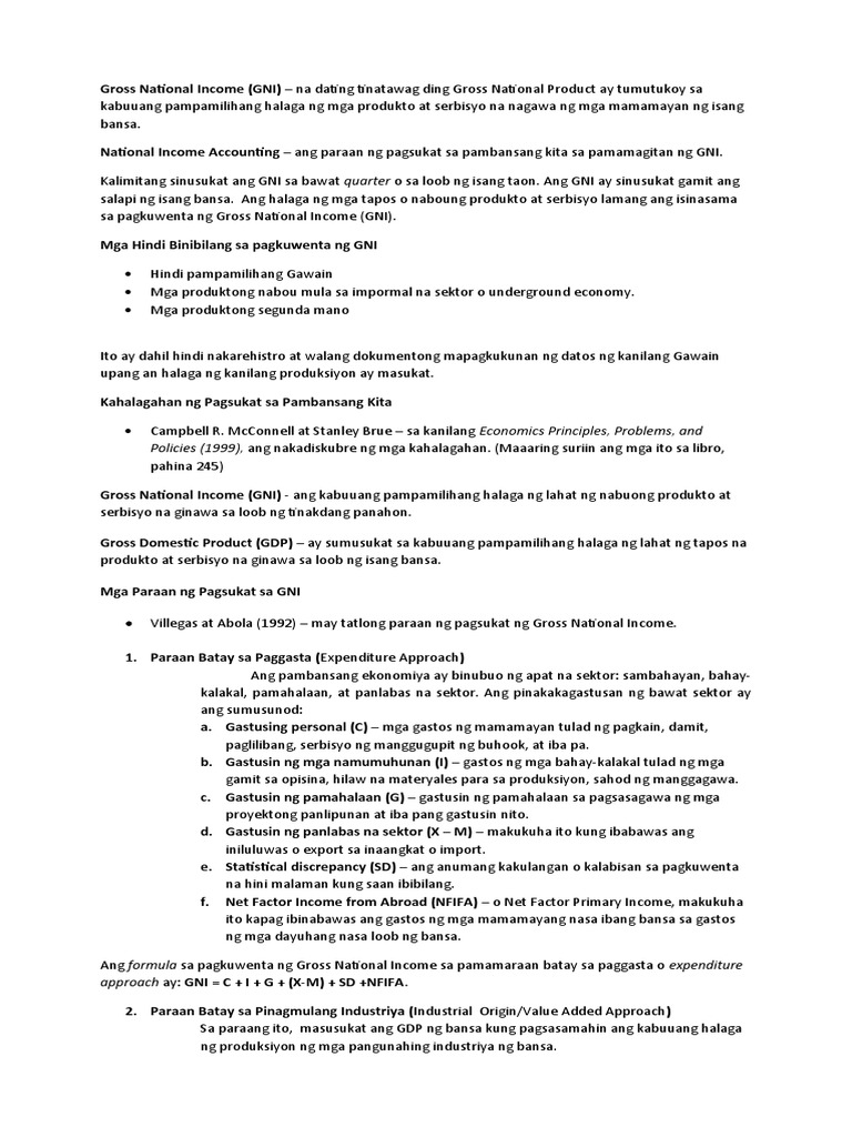 Ang kita na tinatanggap ng mga indibiduwal sahod buwis kita ng mga negosyo na hindi pinaghahati-hatian depreciation undistributed profitsubsidiya mula sa pamahalaan. Ang Gross Domestic Product naman ay sumusukat sa kabuuang pampamilihang halaga ng lahat ng tapos na produkto at serbisyo na ginawa sa loob ng isang takdang panahon sa loob ng isang bansa. Mga mamamayan ng bansa ang nagmamay-ari ng mga salik ng produksiyong ito kahit saang bahagi ng daigdig ito ginawa.