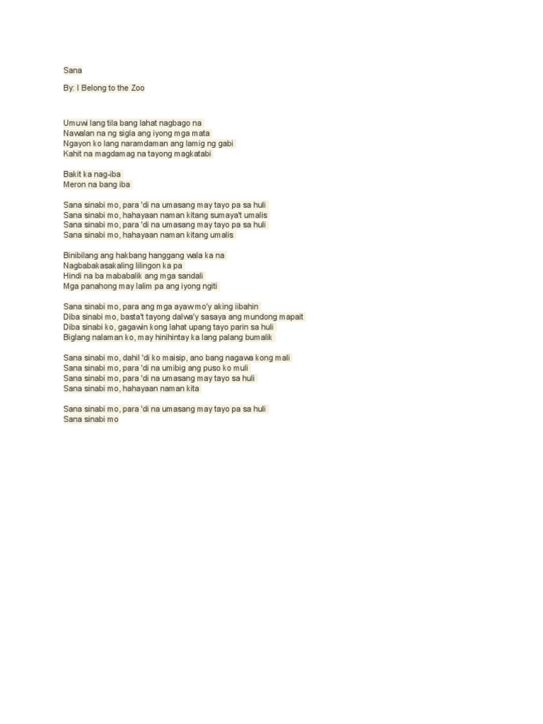 View Umuwi nang tila bang lahat nagbago nadocx from PHY MISC at St. Umuwi nang tila bang lahat nagbago na Nawalan na ng sigla ang yong mga mata Ngayon ko lang naramdaman ang. Free printable and easy chords for song by I Belong to the Zoo - Sana.